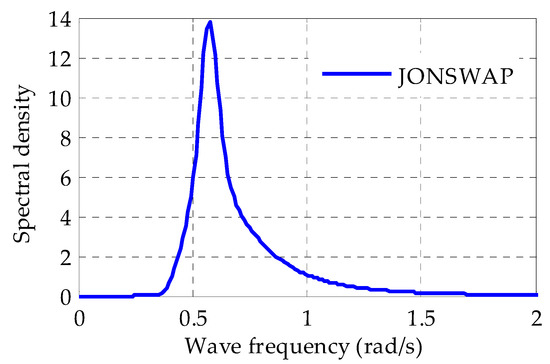 The JONSWAP model is a well-established theoretical model utilized for the prediction of ocean wave characteristics, taking into account parameters such as wind speed, direction and duration. Developed collaboratively by a group of researchers from multiple European countries in the 1970s, its primary objective was to enhance offshore engineering designs by providing accurate wave predictions. In this study, the effectiveness of the proposed control systems was assessed using the JONSWAP model, a widely accepted simulation tool in wave research. Figure 2 showcases the JONSWAP wave band, exhibiting a prominent frequency peak of approximately 0.5 rad/s.