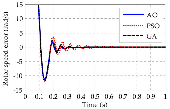 Rotor speed error performance of AO, PSO and GA.