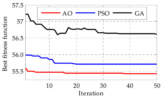 Iteration wise performance of AO, PSO and GA.