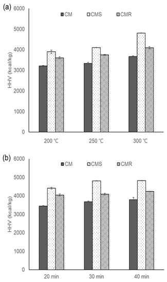Higher heating values of CM, CMS, and CMR according to (a) carbonization temperature at 30 min and (b) carbonization time at 300 °C.