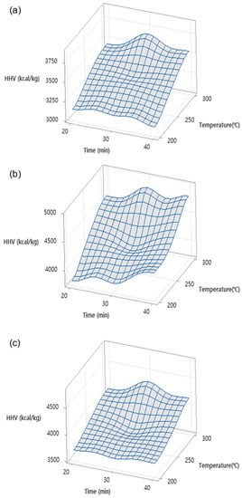 Based on the response surface analysis using Minitap, as shown in Figure 3, the heating value of CM was estimated a function of torrefaction temperature and time:
