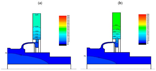 Figure 21 presents isotherms at the axial cross-section of the brake disc at the end of braking time on the test stand. Calculated temperatures concern the end of braking from the initial speed of (a) v0 = 200 km/h, (b) v0 = 250 km/h, (c) v0 = 300 km/h, (d) v0 = 350 km/h. For each case, the highest temperature reached can be observed near the friction surface of the disc brake. It should be noted that there are high temperature gradients near the rubbing surface. The temperatures of the disc hub are not so high. The lowest temperatures are registered for the test stand shaft.
