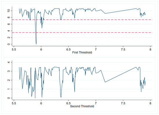 Among them, under the null hypothesis, the threshold, , cannot be identified. Moreover, the bootstrap approach achieves the first-order asymptotic distribution, so that the null of no threshold impact is rejected if is larger than the intended critical value, according to the asymptotic distribution of , which is non-standard and rigorously dominates the chi-square distribution [64].