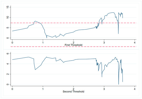Specifically, when the threshold variable is at a high level, the coefficient estimate for the effect of renewable energy consumption on carbon emissions is −0.649. Similarly, when the threshold is at a low level, the coefficient estimate is −0.556. These negative and significant coefficients signify that the effect of renewable energy consumption on carbon emissions remains negative in both the high- and low-level phases. This suggests a nonlinear relationship, characterized by varying effects at different threshold levels.