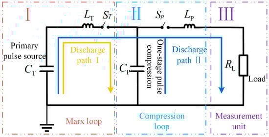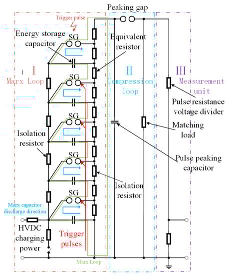 Since the residual inductance of the Marx circuit cannot meet the requirements of the rise time in 2 ns, a pulse steepening unit was designed to effectively shorten the rise time of the output voltage pulse, which has been proven in a large number of nanosecond pulse source research and engineering practices [9,10,12,13,14,15]. The structure of the pulse generation circuit is shown in Figure 1, which mainly contains three parts: Marx pulse generation unit I, pulse steepening unit II, and nanosecond pulse measurement unit III. The principle of the nanosecond high-voltage pulse generation circuit is simplified, as shown in Figure 2. The primary pulse circuit in the left mesh is the Marx loop, and the pulse compression loop is in the right mesh.