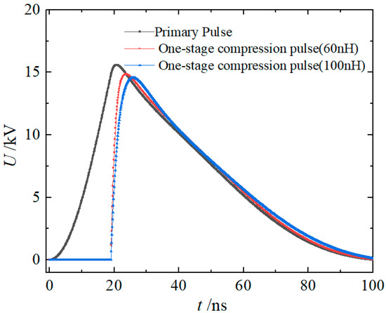 Reducing the steepening loop inductance can produce a nanosecond pulse voltage waveform with faster rise time. When the steepening loop inductance Lp is reduced from 100 nH to 60 nH, the rise time can reduce from 3.438 ns to 2.275 ns, and the output voltage increased from 14.48 kV to 14.85 kV, as exhibited in Figure 4. Therefore, high-pressure, small-gap coaxial switches are designed to use in the loop to reduce the equivalent inductance and optimize the waveform quality.