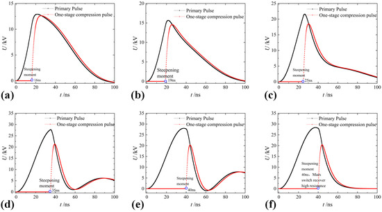 Primary pulse and compression pulse with different action time of the steepening gap: (a) tst = 16 ns; (b) tst = 19 ns; (c) tst = 25 ns; (d) tst = 35 ns; (e) tst = 40 ns; (f) tst = 40 ns, and Marx switch recover high resistance.