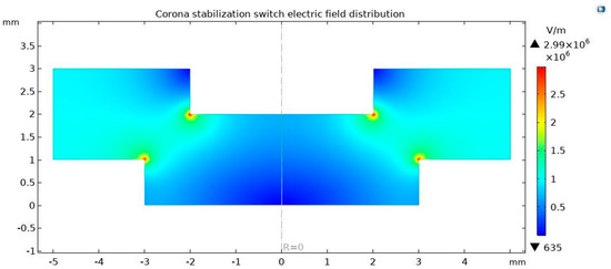 The operating performance of the corona-stabilized switch is influenced by the electric field distribution characteristics. The electric field simulation result (Figure 8) shows the significantly distorted electric field in the sharp corner region of the electrodes. The inhomogeneity factor of electric field reaches 2.5.