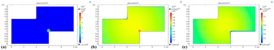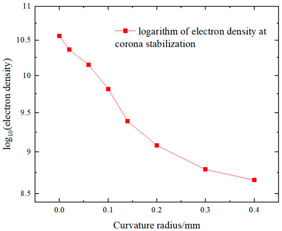 The corona region is formed in the electric field distortion region shown in Figure 8. The geometry parameters of electrode affect the electric field distribution and, thus, determine the characteristics of the corona zone. Under stable corona discharge conditions, the particle distributions in the gap with different electrode curvatures (the radius of curvature be expressed in r) are shown in Figure 9. The corresponding maximum electron densities are compared in Figure 10.