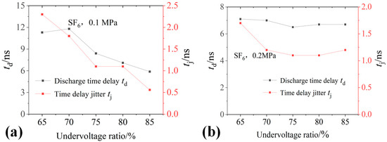 Experiments were carried out on the conduction characteristics of the designed corona-stabilized switch. Under different voltage ratios (ratio of operating voltage to self-breakdown voltage), the trigger delay and jitter characteristics of switch were investigated in different SF6 environments with different pressures, as shown in Figure 11.