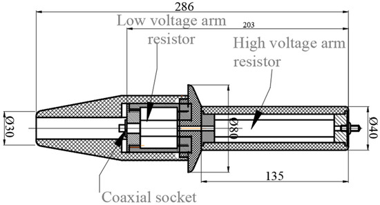 Based on the analysis of the equivalent circuit of the voltage divider, the resistance value of the nanosecond pulse resistance divider was selected in the range of 500–1000 Ω. The response time of the sensor must be in the range of 1–2 ns. Non-inductive metal oxide film resistors were chosen to ensure the stability of the scale factor of the resistive divider in the nanosecond pulse frequency domain. Furthermore, considering the skin effect in the high-frequency electromagnetic environment, the thickness of the resistive film should be less than 100 μm. The low and high voltage arms are connected in series in the coaxial structure tube core with a Teflon-insulated shell. A special metal plug was used at the high voltage end to provide a reliable connection to the generator output.