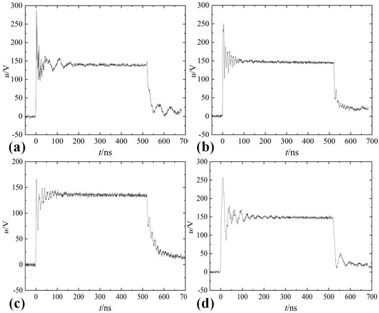 In the operating voltage range (15–60 kV), the maximum relative standard deviation of the peak value of the output pulse of the nanosecond pulse test system is 1.517%, the relative standard uncertainty is less than 5 ‰, which demonstrates a fairly high degree of output stability. In addition, the relative standard deviation of the nanosecond pulse test system is considered to be the synthetic relative standard deviation of the nanosecond pulse generator, the resistance divider, the measurement cable, and the oscilloscope. The maximum deviation of the DPO3054 oscilloscope is ±0.5% according to the test results of the National Metrology Calibration Center, so the maximum relative standard deviation for the nanosecond pulse generator can be deduced to be less than 1.432%.