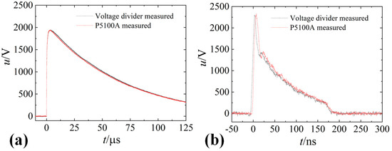 Waveforms measured by the resistance divider and P5100A probe under (a) 1.2/50 μs and (b) nanosecond pulses.