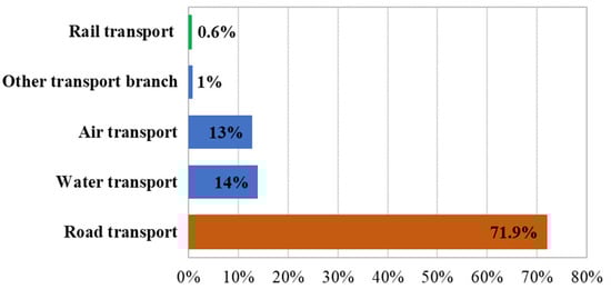 In terms of the emissivity of transport means, it is assumed that Europe will become the first climate-neutral continent in the world by 2050. In order to make this objective achievable, it is necessary to work towards sustainable transformation also in the area of transport. One of the proposed solutions is to use renewable energy [10]. It has many potential advantages, including reduced greenhouse gas emissions, energy supply diversification, and reduced dependence on the fossil fuel markets (especially diesel and gas). The development of renewable energy sources can also stimulate employment growth by creating jobs in the new green technologies sector. The economic branch of transport is currently emitting approx. 22% of greenhouse gases in the European Union [11], most of which, over 70%, is emitted by road transport (Figure 1) and passenger vehicles (Figure 2). Rail transport is the least emissive.