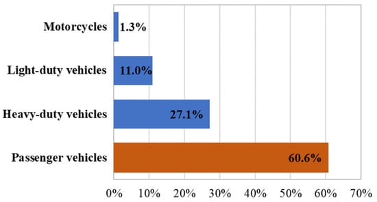 Pollution in road transport is mainly generated by fuel combustion, and non-fume emissions, e.g., brake pad wear, tyre wear, a secondary dusting of sediments and particles present on the roadway, etc. The pollution level in road transport is affected by the length and distribution of the road infrastructure, fuel type and quality, engine features and maintenance, traffic congestion, as well as the vehicle type and the manner of operation. The impact of transport on the surroundings is based on the evaluation of transport activity external effects. External costs are usually associated with the negative effects of transport on the surroundings. In terms of environmental impact, the external costs of transport with the most significant effects on human functioning include air pollution, climate change, and noise. Passenger vehicles contribute to the highest share of air pollutant emissions (Figure 3). Light-duty or heavy-duty vehicles are responsible for nearly 40% of pollutant emissions [14]. The research subject is also motivated by the systematic increase in transport work conducted by road transport and the persistently high share of conventional fuels used to power the vehicles operated in road transport. The structure of air pollutants based on the fuel used is presented in the following figure: