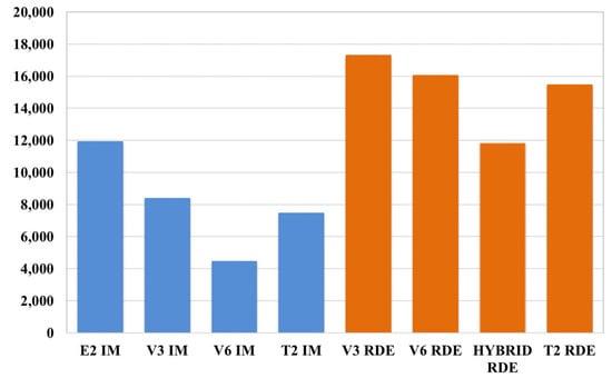 The IM method’s carbon dioxide emissions turned out to be lower than those obtained in the RDE tests for each of the analysed vehicle types. The emissions determined by the IM method for V3 and T2 type vehicles were twice as high as the values obtained in the RDE tests, while the emissivity of the V6 type vehicle was three times higher. However, it is noteworthy that the proportions of the obtained emission results and trends were maintained. The emissivity of the V3 petrol vehicles is higher in both methods than that of the V6 diesel vehicles. On the other hand, the emissivity of the T2 light-duty vehicles is lower than that of the V3 petrol vehicles but higher than the emissivity of the V6 vehicles. The smallest difference between the emissivity obtained in the IM method and the RDE tests was recorded when hybrid vehicle results were compared. In terms of carbon oxide emissions, the pollutant emission values determined by the IM method for the V3 and T2 vehicles turned out to be higher by almost half than those obtained in the RDE tests for both vehicle types. For the V6 type vehicle, the air pollutant emissions determined by the IM method were over three times lower than pollutant emissions obtained in the RDE tests. The measured carbon oxide emissions of the hybrid vehicle were not substantially lower than those of other vehicle types.