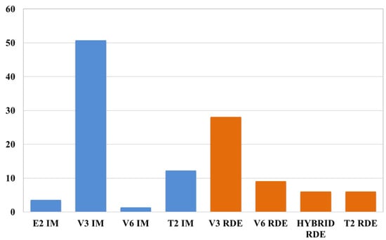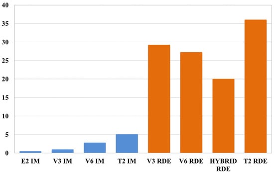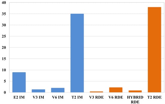 The emissivity tests on V3, V6, and hybrid type passenger vehicles were carried out during RDE tests in the Poznań urban area with the use of test equipment placed inside the vehicle and in the trunk, i.e., the SEMTECH DS gaseous exhaust components analyser and the EEPS 3090 mass spectrometer for measuring particulate matter. The vehicles, along with the measuring equipment were prepared accordingly prior to testing, i.e., they were exposed to a 20 °C temperature without external climate exposure. The gaseous exhaust components were measured with the analyser. An exhaust fume collection system, in which the exhaust fumes moved at a temperature of 191 °C to prevent water condensation, was mounted between the exhaust analyser and the vehicle’s exhaust system. After the exhaust fumes were fed to the analyser through a special filter, the particulate matter was separated, and the exhaust fumes were fed into the flame ionisation detector (FID), in which the concentration of hydrocarbons was measured. Then, the exhaust fumes were cooled down to a temperature of 4 °C and moved to the non-dispersive ultraviolet radiation (NDUV) analyser in which the concentration of nitrogen oxides was determined. The exhaust fumes mixture was then fed into the non-dispersive infrared radiation (NDIR) analyser to measure the concentration of carbon oxide and dioxide. Finally, the SEMTECH DS device measured the oxygen concentration using an electro-chemical analyser. Additionally, the separated particulate matter was fed into the second TSI analyser (particulate matter counter). However, in the case of the particulate matter results, the test featured a comparative analysis of the statistically determined emissivity with literature data used to calculate the generated particulate matter mass based on the given vehicle’s fuel consumption per 100 km [42]. Each vehicle travelled 100 km distance during the tests. During the verification of the IM indicator method, it was assumed that each vehicle type travels a distance of 100 km. The list of results of the vehicles’ total emissivity determined using the IM and RDE methods is presented in Figure 17, Figure 18, Figure 19 and Figure 20. The comparison was provided for four primary air pollutants, i.e., CO, CO2, PM, and NOX. In addition, conventional vehicles’ emission (V3, V6, T2) and hybrid vehicle performance were compared with an electric vehicle’s emission performance. A Nissan Leaf vehicle (E2) with a power consumption up to 0.17 kWh/km was selected for the comparative analysis.