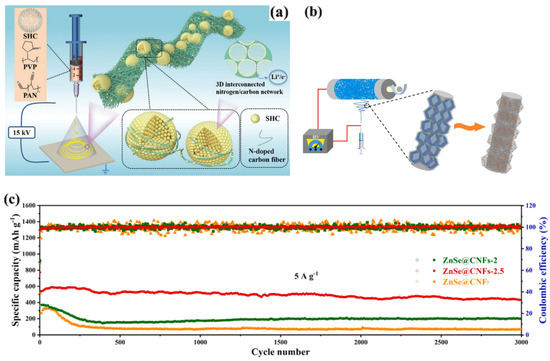 - Zhang, T.; Qiu, D.; Hou, Y. Free-standing and consecutive ZnSe@ carbon nanofibers architectures as ultra-long lifespan anode for flexible lithium-ion batteries. Nano Energy 2022, 94, 106909. [Google Scholar] [CrossRef]