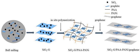 | 11 | SiOx-G/PAAPANi/ graphene | 1126 mAh/g (at 500 mA/g) | 842.3 mAh/g (at 500 mA/g, 100 cycles) | N/A | N/A | [29] |