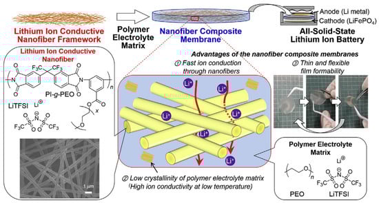 - Watanabe, T.; Inafune, Y.; Tanaka, M.; Mochizuki, Y.; Matsumoto, F.; Kawakami, H. Development of all-solid-state battery based on lithium ion conductive polymer nanofiber framework. J. Power Sources 2019, 423, 255–262. [Google Scholar] [CrossRef]