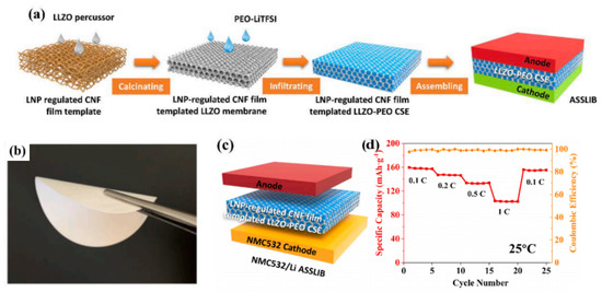- Zhang, H.; An, X.; Long, Y.; Cao, H.; Cheng, Z.; Liu, H.; Ni, Y. A thin and flexible solid electrolyte templated by controllable porous nanocomposites toward extremely high performance all-solid-state lithium-ion batteries. Chem. Eng. J. 2021, 425, 130632. [Google Scholar] [CrossRef]