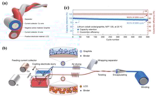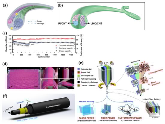 - He, J.; Lu, C.; Jiang, H.; Han, F.; Shi, X.; Wu, J.; Wang, L.; Chen, T.; Wang, J.; Zhang, Y.; et al. Scalable production of high-performing woven lithium-ion fibre batteries. Nature 2021, 597, 57–63. [Google Scholar] [CrossRef] [PubMed]