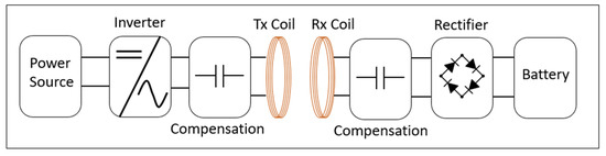 Wireless power transfer (WPT) systems have become a convenient technology for many applications as the cordless solution, which prevents trip hazards and increases mobility for various devices, such as vacuum cleaners, electric toothbrushes, smartwatches, and kitchen appliances [1,2,3,4]. For some medical implants, sensors, and pacemakers, WPT offers safe charging without any physical contact or the necessity of going under surgery [5,6,7,8,9]. Other advantages of WPT systems are easy implementation, moderate to low maintenance, and small area required for operation [10]. Consequently, high-power applications, such as electric vehicles (EV) [11,12,13,14], autonomous guided vehicles (AGV) [15,16,17], and unmanned aerial vehicles (UAV) [18,19,20], are charging wirelessly on roads, in shopping centres, high towers, roofs, warehouses, ports, and other harsh environments. For AGV, WPT systems have improved health and safety, as the contact-based charging system can create electrical sparks during physical connection, which might lead to fire hazards in dusty environments. Despite the many benefits of WPT systems, the power transfer efficiency could be better due to the low coupling factor, ferromagnetic core saturation limit, and heating losses. These issues have been the objective of numerous research in recent years. A WPT system is composed of a transmitter and a receiver. The transmitter (Tx) has a DC power source, an inverter, a compensation circuit, and the Tx coils. The RX coil is integrated with a compensation circuit and a rectifier on the receiver side before reaching the AGV battery (load), as illustrated in Figure 1. Compensation circuits are not a requirement for WPT. However, these circuits are an outstanding feature to reach power factor unity, lowering losses, and maximizing power transfer [21,22].