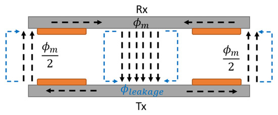 Conventional WPT systems with a circular coil on a planar ferrite core have magnetic flux density as illustrated in Figure 3. Considering that the coil windings, copper rectangles, have current field entering the page plane on the left side and leaving on the right, then, the magnetic field direction at the edges is from Tx to Rx, while in the WPT system it is the opposite direction. Since the magnetic flux density from the coils at the centre has the same direction and intensity, the amplitude is stronger in comparison to the edges. When discarding the losses, the centre magnetic flux is equal to while the edges have a flux equivalent to , as described in Figure 3.