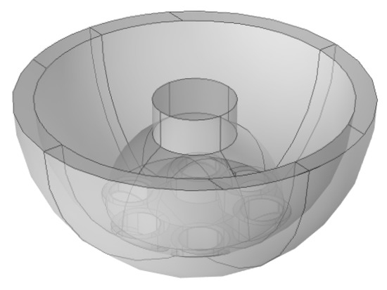 The proposed WPT transmitter ferrite is a unique double-concave disc where the magnetic flux flows from six circular coils located at the inner part of the concave disc, as illustrated in Figure 4 and Figure 5. The first concave disc has six rods at the bottom, where the transmitter coils are placed. Each inner rod has a thickness equal to α. At the top, the single cylinder rod has a 2α diameter. This top rod acts as a conductor for the magnetic flux, concentrating this flux into one spot and decreasing the leakage flux. The outer concave disc is physically connected to the six rods from the inner concave bottom. The outer disc thickness is equal to Φ so that the flux has an equal cross section area to flow through the disc ends, as shown by the black arrow in Figure 4. Additionally, the disc structure permits the magnetic flux to flow on an Omni dimensional, increasing of power density without overheating specific areas due to high magnetic flux concentration.