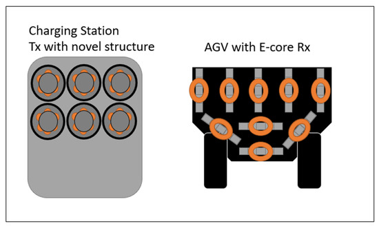 Figure 6 illustrates how the proposed WPT system can be assembled. The Tx unique structure is developed as an array of multiple units inside the charging station. On the other hand, multiple Rx E-core units cover the AGV side which increase the surface area utilized for wireless charging, resulting in an adaptive WPT system capable of fitting any AGV. Angular misalignment permits that the Rx units to be inserted into the AGV corners and difficult areas whereas a conventional planar pad cannot be installed.