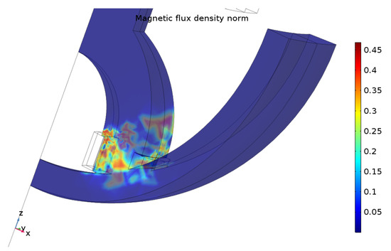 The differences between coarse and finer mesh were minor. In Figure 7, the simplified 3D model illustrates the magnetic flux density when the input current changes directions at the transmitter. Concentrated magnetic flux areas are present around coil windings and at the inner concave disc. The magnetic flux density in these areas can reach up to 0.45 T. The flux distribution is not homogenous since a wide range of the ferrite core has low to no magnetic flux density. These highlighted areas emphasize where eddy currents are located while the concentration within the coils space occurs due skin effect. The skin effect at higher frequencies pushes the electric charges to the wire borders, which leads to high charges near the ferrite domain. This stronger charge concentration at the wires boundaries increases the magnetic field from the windings, which also oscillates at high frequency, resulting in a stronger current induction at the ferrite surface, following Faraday’s Law. Therefore, the high concentration of charged particles, near the windings in this model borders, induced eddy currents in the transmitter core surface.