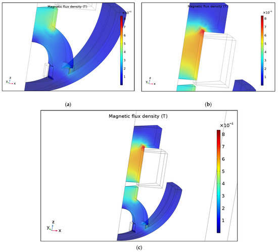 Magnetic flux density at maximum power transfer occurrence. (a) WPT transmitter; (b) WPT receiver; (c) complete WPT system.