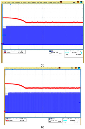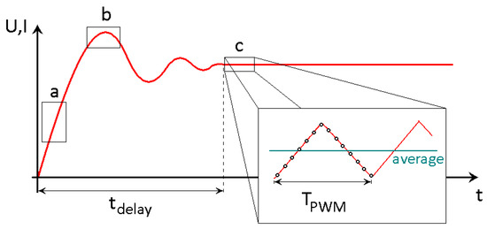 During the measurements, the total number of samples was adjustable. The goal was to find the minimum number of samples for a given sample ratio that ensures repeatability and relatively high accuracy of the measurements. Additionally, the acquisition of the samples over a larger number of switching periods in general improves the signal-to-noise ratio [29], which has a positive impact on the accuracy and repeatability of the system. The final parameter that was changed during the measurements was the time delay, tdelay (Figure 2), which introduces a time gap between the change in the duty cycle and the measurement itself. The introduction of the delay enabled measurements at different points in time on the transient curve (a–c in Figure 2).