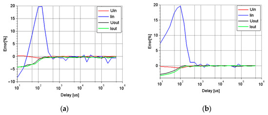 Errors occurring in voltage and current measurements for different delays and the number of samples: (a) 14 samples corresponding to one switching cycle; (b) 140 samples corresponding to ten switching cycles.