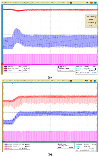 Oscilloscope measurements of the (a) input signals and (b) output signals of a converter. The blue curves are currents, whereas the red curves are voltages. The purple curves represent the PWM signal.