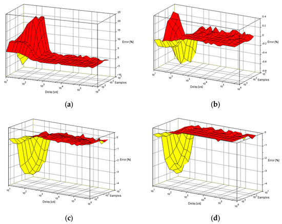 Errors occurring in voltage and current measurements for different delays and the number of samples: (a) input current, (b) input voltage, (c) output current and (d) output voltage.