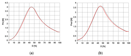 Power characteristics measured in the peak error for the (a) power on the input of the converter and (b) power on the output of the converter. Continuous lines represent power measured in the steady state, while dashed lines represent power measured for the largest error.