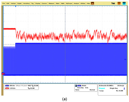 Figure 2 shows how the measurement was performed. If the number of samples was relatively small in comparison to the transient time (e.g., 14 samples corresponding to one switching cycle), the measurement included only a small part of the waveform. Therefore, when the ADCs measured the voltages and the currents at the rising edge (a in Figure 2), the final result would be expected to be smaller than the average value in the steady state (c in Figure 2). However, if the measurement was taken during the overshoot (b in Figure 2), the resulting value would be expected to be larger than it is in the steady state. Figure 3a,b shows the results of the measurements that included 14 and 140 samples, respectively, and that were taken at different points in time (with different delays). Figure 4a,b shows the signals measured using an oscilloscope. The time base in Figure 4 was set to 200 µs/div. In Figure 4a, the current and voltage gains were set to 20 mA/div and 900 mV/div (with 9.6 V offset), respectively. As for Figure 4b, the current and voltage gains were set to 10 mA/div and 200 mV/div (with 2.16 V offset), respectively.