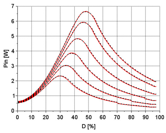 This part of the experiment evaluated whether the proposed measurement method was accurate. To test the accuracy, we measured the power curve with the proposed measurement method and compared it with reference characteristics. The reason that the power characteristics were chosen is that, during measurement, the duty cycle changes throughout the whole range. Therefore, the currents and voltages experience different transients and thus provide different experiment conditions. To achieve reliable results, the reference power characteristics were measured with an initial delay equal to 1000 μs, whereas the number of samples was equal to 1400, which, in the case of the used system, was equivalent to 100 switching cycles. The proposed measurement method included 140 samples, which were equivalent to 10 switching cycles of the PWM signal. The measurements were taken for different irradiation levels using the measurement setup presented in Table 1. The results of the measurements are presented in Figure 11. The red lines represent the reference power curves, whereas the dashed lines refer to the proposed measurement with automatic delay selection. The difference between the MPP measured in the steady state (solid line) and the power measured using the proposed method (dashed line) in most cases did not exceed 0.2%. In one case, the difference was equal to 0.43%.