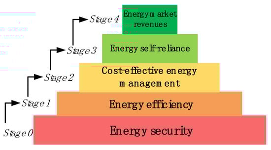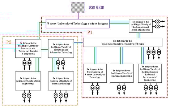 The foundation of the pyramid of energy goals is the energy security of the facility—Stage 0. It should be emphasized that, according to the authors, without ensuring an adequate level of security in supplying the loads, including the particularly critical loads, there can be no further process of improving the energy efficiency of facilities or investing in modern energy solutions. There is a possibility that the savings from installing, for example, renewable energy sources will be absorbed by the cost of not delivering energy to selected critical loads. At this stage in the development of distributed generation resources on university campuses, decision-makers should take care to install generators that provide power that is safe for the facility. The next step is to plan distributed generation development solutions for energy efficiency—Stage 1. Such tasks, in terms of DG development, can include investment in renewable energy sources that do not require significant interference with campus infrastructure, e.g., photovoltaic power plants on rooftops. The capacity of generators should also be expanded to include further loads requiring practically uninterruptible operation. A significant increase in the importance of distributed generation can be seen in the next stage of the development of these technologies on university campuses. We are talking about providing opportunities to optimize the management of electricity from an economic perspective—Stage 2. At this stage, the diversification of RES and other technologies, such as electricity storage, should be considered, but there must be an economic viability to the project. It is proposed that RES installations scattered over many buildings will operate in a coordinated manner, forming a virtual power plant—VPP [56]. The penultimate stage in the development of distributed generation technologies on university campuses is investment in energy independence—Stage 3. At this stage, the construction of a stable source, not necessarily RES, but with a low carbon footprint, should be considered. In addition, it should be ensured that energy security measures are implemented through the aforementioned source and energy storage facilities, accumulating surpluses from distributed RES installations. Everything should also be managed by a superior control and supervision system. The last stage of the development of distributed generation technology on campuses (Stage 4) takes into account the assumptions from Stage 3 and indicates the further development of electricity storage and demand-side reduction activities for consumers. This means that, in addition to maintaining the essential energy functionality of the facility, there are opportunities for additional revenue from the sale of surplus energy and the provision of other services to distribution system operators (flexibility services) or the transmission system operator (ancillary services, demand reduction, capacity mechanisms). It should be emphasized that the possession of demand reduction resources can bring significant profits, especially in cases of an increasing number of hours in which the demand will not be covered by the generation.