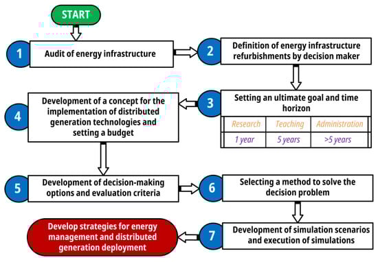 The issue of establishing strategies for energy management and the development of distributed generation technologies on university campuses is complex and requires the design of a holistic approach to the subject. Universities are such complex administrative units, combining many areas from everyday life, that it is necessary to propose a methodology for assessing their ability to achieve energy efficiency improvement goals while promoting sustainable development. It should also not be forgotten that, particularly in Europe, university campuses are located in urban centers [32], which do not facilitate the process of planning for the construction of their own energy sources as they are often facilities under the protection of heritage conservators [55]. Therefore, as a first step, decision-makers should order a detailed audit of the electricity infrastructure for the facilities under consideration. A facility should be understood as a university campus with its own power supply infrastructure with points of connection to the power grid or a single building with an independent connection. Next, the priority modernization measures for the existing power infrastructure should be defined. The next step is to define the project budget and establish a time horizon. At this point, the decision-maker should indicate whether the tasks planned for implementation are to be implemented immediately (the criterion for the fastest effect) or are to be the basis of a long-term strategy. Due to the construction time of individual low-carbon electricity solutions, it is suggested to set a threshold of 1 year, 5 years and more than 5 years. The decision-maker should also decide whether the planned development of distributed generation technologies is intended to strengthen the field of research, teaching or broader administration.