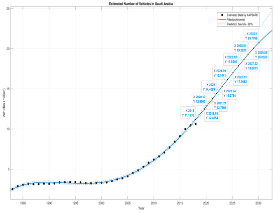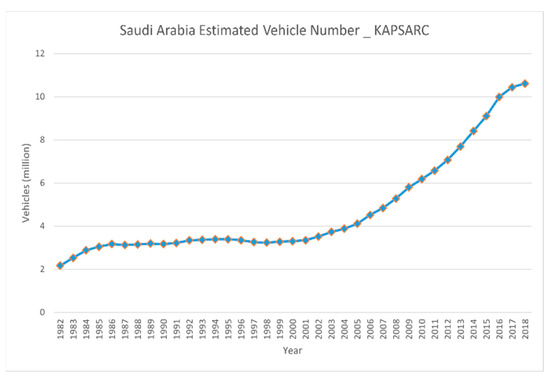 According to the statistics, Riyadh City’s share represents 24.1% of the total vehicles in Saudi Arabia [36]. Hence, for the year 2030, the estimated number of vehicles for Riyadh City is 24.1% of 20.8 million, and this is equal to 5.013 million vehicles.