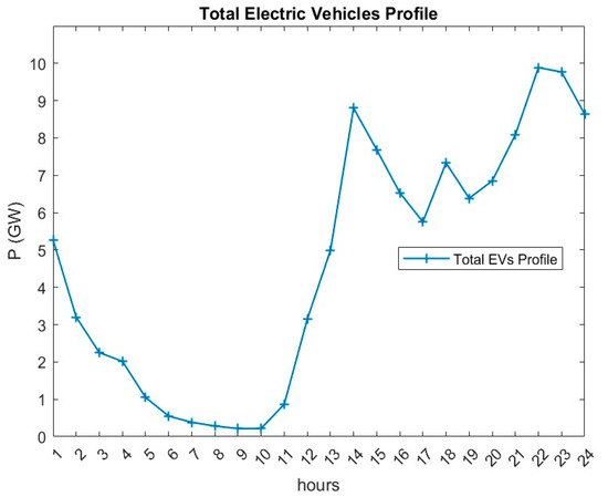 This section aims to estimate the year 2030 peak load, generation capacity, and the number of vehicles, further used in Section 4. The generation capacity is assumed to be a straight line at the maximum capacity. Regarding the conventional load profile, the annual statistical report for 2020 by WERA states that the peak load occurs in the summer. As well, a typical summer day’s load profile is shown; Figure 3 shows typical day curves for Saudi Arabia [32]. The load profile of the study was obtained by shifting the typical day’s profile curve by the ratio of its maximum point concerning the peak load estimated in 2030, which is discussed in the next section. As shown, the EVs’ charging profile is variable, with peaks in the afternoon and evening. A sample of EV charging is shown in Figure 4.