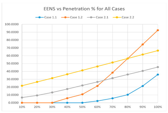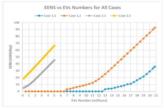 - Figure 18 shows EENS behavior curves for all cases considering all increments. With increasing the penetration percentage, the EENS increases. Cases 2.1 and 2.2 show linear EENS behavior concerning the EVs’ number, while Cases 1.1 and 1.2 show almost exponential behavior, with respect to the EVs’ number.