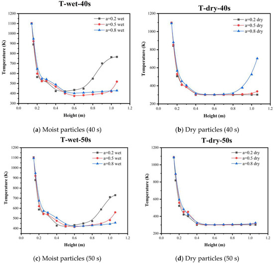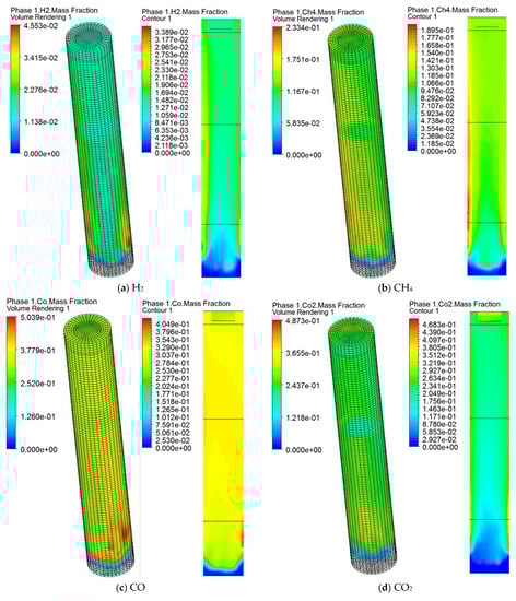 For the gasification of moist solid waste particles (Figure 19a,c,e), the CO mass fraction rose rapidly in the bottom region (from 0 to 20–35%) owing to the pyrolysis and reduction reaction of C(s) with CO2. The H2O mass fraction increased rapidly (from 0 to about 10%) above a height of 0.4 m owing to water evaporation. There was little change in the species above the middle of the furnace, with only a small decrease in CO mass fraction (about 5–10%) and a small increase in CO2 mass fraction (about 5–10%), indicating that CO continues to react with O2 and H2O to produce CO2. At the end of the gasification process, there was some O2 left, indicating that the gas–solid multiphase flow was not coupled perfectly with the chemical reaction, and O2 was not completely consumed (about 5% remaining) in the oxidation zone.