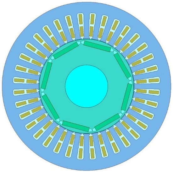 In reference [15], the simulated annealing algorithm was used to optimize the amount of permanent magnets used in the motor to reduce design costs. Reference [16] combined the chaotic algorithm and particle swarm optimization algorithm to optimize the slot shape and other variables of a micro permanent-magnet motor. In reference [17], the particle swarm optimization algorithm and genetic algorithm were combined and used to optimize the permanent magnet linear motor, resulting in a significant reduction in the number of iterations and an accelerated convergence speed. Reference [18] proposes a hierarchical optimization design method for the motor rotor structure, with the objectives of reducing the torque ripple and electromagnetic noise. The NSGA-II algorithm and a univariate parameter method are combined to achieve a high-performance optimization design. Reference [19] uses NSGA-II to optimize the magnet shape, rotor yoke, and stator slot of an 8-pole 48-slot IPMSM and creatively introduces the Nelder–Mead method to solve the geometric constraint repair problem, achieving the maximum motor torque and minimal torque ripple. Reference [20] uses a genetic algorithm to perform multiobjective optimization design on the rotor structure of permanent-magnet synchronous motors, with the optimization objectives of the slotting torque, torque ripple, harmonic distortion rate of the air gap magnetic flux density, and the amplitude of the no-load back electromotive force.