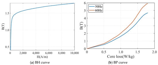 The interior permanent magnet synchronous motor (IPMSM) is widely used in the field of ship electric propulsion due to its high efficiency, low noise, and low vibration characteristics. The design of the ship propulsion permanent magnet synchronous motor in this paper requires a rated power of ≥100 kW, torque ripple of ≤5%, average torque of ≥340 N·m, stator outer diameter of ≤250 mm, and efficiency meeting the minimum efficiency requirement of 93 % for ship motors. Based on electromagnetic theory and design experience, this paper preliminarily determines the motor structure parameters. Then, after simulation and verification using Maxwell finite element software, a 36-slot 8-pole IPMSM model is obtained as shown in Figure 1, and its structural parameters are shown in Table 1. The permanent-magnet uses high-performance neodymium iron boron material N48UH, which has a high magnetic energy product and excellent high-temperature thermal stability, with a Curie temperature of above 150 °C, and can maintain a good magnetic performance even at high temperatures. The stator and rotor core materials were selected as cold-rolled nonoriented silicon steel sheets with a grade of 50WW470, as shown in Figure 2. The BH curve of this material shows that its saturation magnetic flux density is relatively high, up to 1.6 T, which means that it can achieve higher inductance values in smaller sizes. The BP curve indicates that the hysteresis loss and eddy current loss of the 50WW470 material are both low.