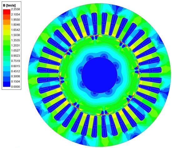 After simulating the transient magnetic field, the distribution of the no-load flux density of the motor is shown in Figure 3. It can be seen that the tooth flux density of the stator is around 1.5 T and the maximum value of the yoke flux density of the stator is 1.32 T, both of which have not reached saturation. The magnetic flux density near the permanent magnet slot is higher due to end leakage and can reach 2.25 T, with a reasonable distribution of magnetic flux density.