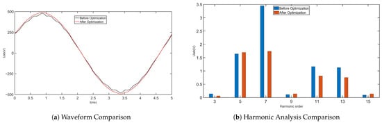 In this paper, a method using eccentric arc optimization is proposed. Figure 4 shows a comparison of the rotor surface shape within one pole range before and after the eccentric arc optimization, where the red dashed line represents the outer circle of the rotor before the eccentric design. By adjusting the surface shape of the rotor, the air gap length and uniformity can be changed, thus affecting the direction and distribution of the motor flux and changing the inductances of the d-axis and q-axis. To reduce the distortion at the air gap magnetic density zero-crossing position, we used a straight-line connected eccentric arc design. After simulating with Maxwell, the air gap magnetic density waveform before and after optimization is shown in Figure 5a, and the FFT analysis of the air gap magnetic density waveform is shown in Figure 5b. It can be observed that the air gap magnetic density waveform is close to a sine wave after the initial optimization, with the fundamental amplitude increasing from 1.09 T to 1.17 T and the odd harmonic content significantly reduced. Meanwhile, Figure 6 shows that the amplitude of the motor’s induced electromotive force is increased and the waveform tends towards a sine wave after the rotor structure is improved, with the total harmonic distortion reduced, demonstrating the rationality of the optimized design.