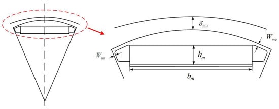 In the design of permanent magnets for motors, in order to maintain a uniform and stable magnetic field, the axial length of the permanent magnet is usually equal to that of the motor iron core. Therefore, the amount of permanent magnet used is represented by the area . The optimization goal for the is 250 mm with a range from 250 mm to 256 mm. The objective function for the weight of the permanent magnet is as follows: